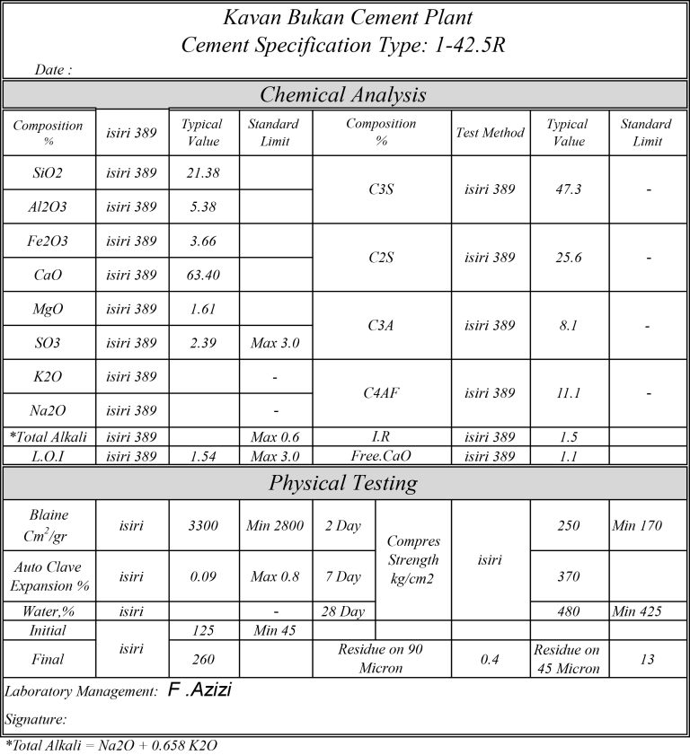 Portland Cement Type 425-1 is classified in Iranian National Standard No. 389 as Type 1 Portland Cement with a strength rating of 425 Kg/cm².